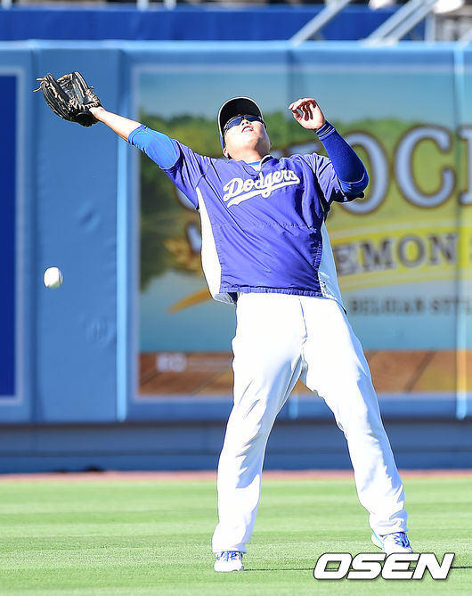 12일(한국시간) 미국 캘리포니아주 로스앤젤레스 다저스타디움에서 열리는 '2014 메이저리그' LA 다저스와 샌디에이고 파드리스와의 경기에 앞서 류현진이 외야 수비를 하고 있다.