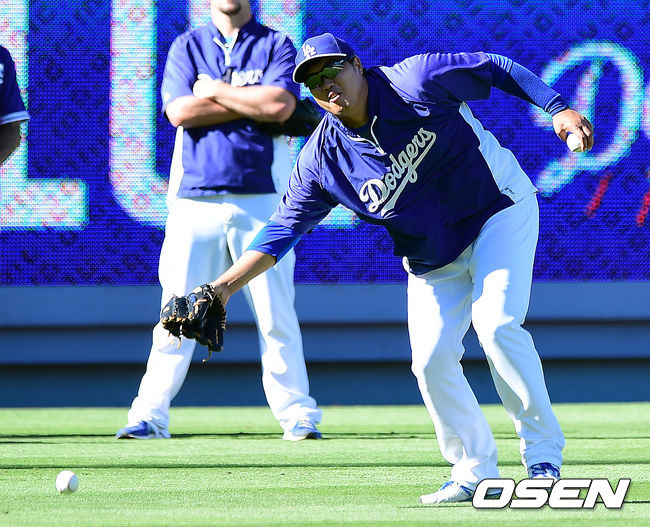 12일(한국시간) 미국 캘리포니아주 로스앤젤레스 다저스타디움에서 열리는 '2014 메이저리그' LA 다저스와 샌디에이고 파드리스와의 경기에 앞서 다저스 류현진이 외야에서 수비훈련을 하고 있다.