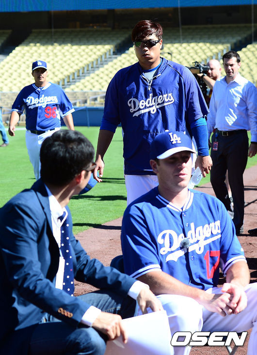 12일(한국시간) 미국 캘리포니아주 로스앤젤레스 다저스타디움에서 열리는 '2014 메이저리그' LA 다저스와 샌디에이고 파드리스와의 경기에 앞서 MBC 스포츠 플러스 손혁 해설위원이 경기장을 찾아 A.J 엘리스의 인터뷰를 하던중 류현진이 다가와 인터뷰를 듣고 있다.