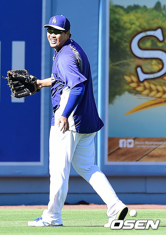 12일(한국시간) 미국 캘리포니아주 로스앤젤레스 다저스타디움에서 열리는 '2014 메이저리그' LA 다저스와 샌디에이고 파드리스와의 경기에 앞서 다저스 류현진이 외야에서 수비훈련을 하다 공을 놓친 뒤 머쩍은 미소를 짓고 있다.