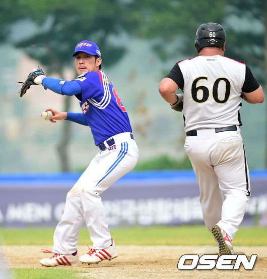 2회말 1사 안양GMB 김경구의 내야 땅볼 이기스의 박재정이 2루에서 주자 박수현을 포스아웃 시킨 후 1루로 송구 하고 있다.