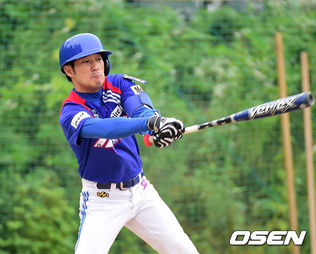3회초 1사 1,2루 탤런트 박재정이 타석에서 파울 타구를 날리고 있다.