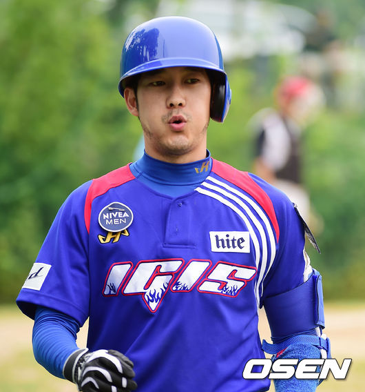 3회초 1사 1,2루 탤런트 박재정이 타석에서 삼진아웃을 당한 후 큰 숨을 내쉬며 덕아웃으로 향하고 있다.