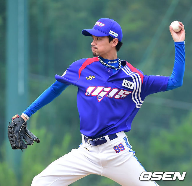 이기스 선발 김용덕이 힘차게 공을 뿌리고 있다.