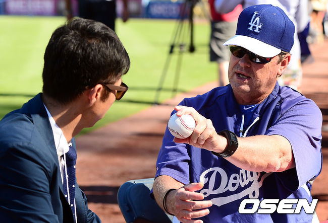 12일(한국시간) 미국 캘리포니아주 로스앤젤레스 다저스타디움에서 열리는 '2014 메이저리그' LA 다저스와 샌디에이고 파드리스와의 경기에 앞서 MBC 스포츠 플러스 손혁 해설위원이 경기장을 찾아 다저스 허니컷 코치와 이야기를 나누고 있다.