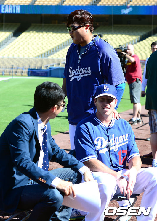 12일(한국시간) 미국 캘리포니아주 로스앤젤레스 다저스타디움에서 열리는 '2014 메이저리그' LA 다저스와 샌디에이고 파드리스와의 경기에 앞서 MBC 스포츠 플러스 손혁 해설위원이 경기장을 찾아 A.J 엘리스의 인터뷰를 하던중 류현진이 다가와 인터뷰를 듣고 있다.