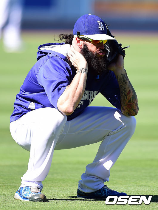 12일(한국시간) 미국 캘리포니아주 로스앤젤레스 다저스타디움에서 열리는 '2014 메이저리그' LA 다저스와 샌디에이고 파드리스와의 경기에 앞서 다저스 윌슨이 그라운드에 앉아 생각에 잠겨 있다.