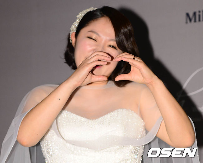 배우 김현숙이 결혼식 기자회견 중 하트를 만들며 웃음 짓고 있다.