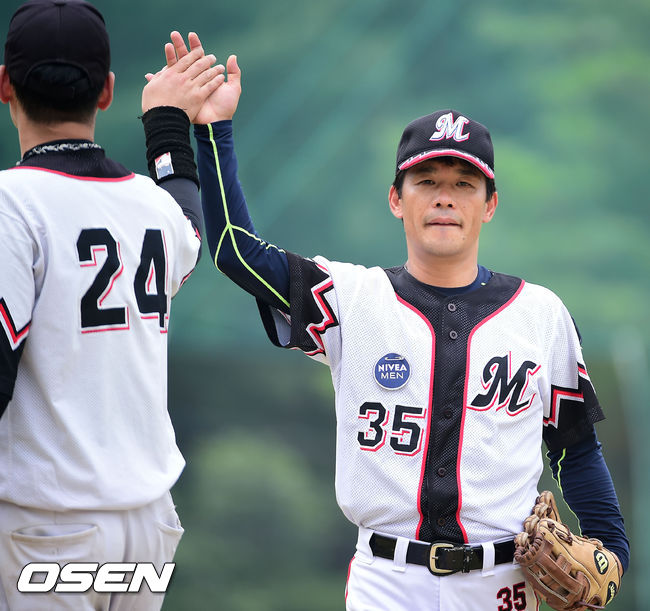 2회를 삼자범퇴로 처리한 서대전고 동문 야구단 선발 박근명이 덕아웃으로 들어오며 하이파이브를 하고 있다.