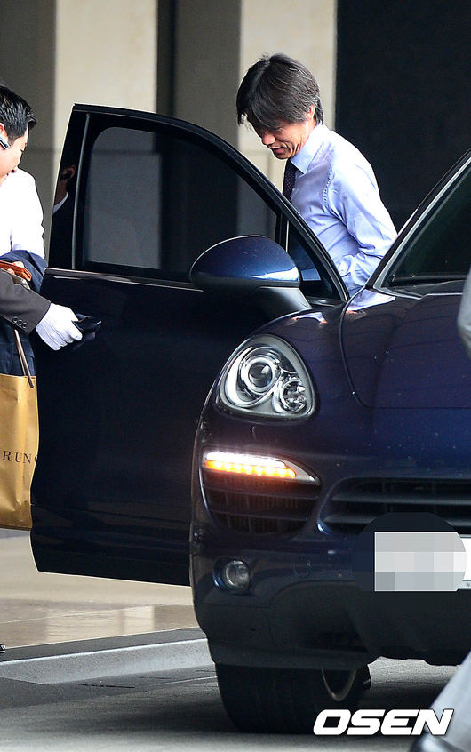 홍명보 전 축구국가대표감독이 12일 오전 서울 장충동 신라호텔에서 열리는 '블루드래곤' 이청용 결혼식에 참석을 마친 뒤 식장을 나서고 있다.