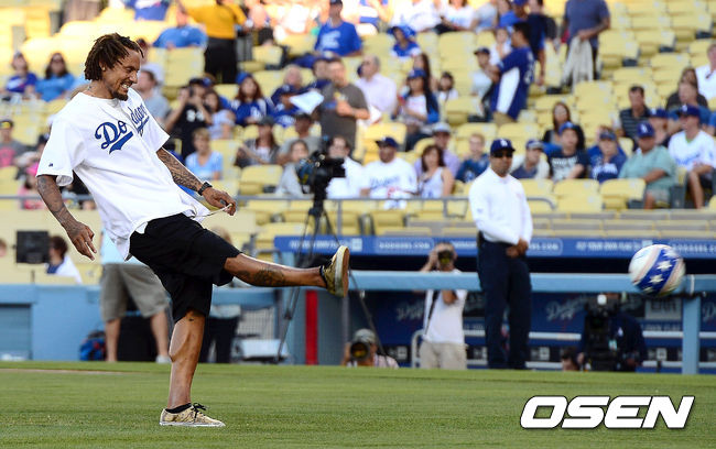 경기에 앞서 축구선수 저메인 존스가 축구공을 차는 시구를 하고 있다.