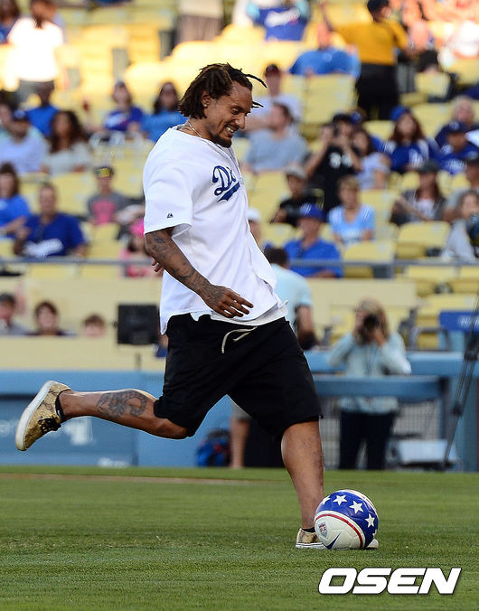 다저스타디움에서 축구공으로 시구하는 저메인 존스