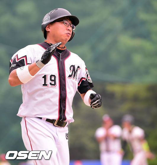 4회초 1사 주자 2루 서대전고 동문 야구단 대타 전호석이 투런 홈런을 날린 후 박수를 치며 그라운드를 돌고 있다.