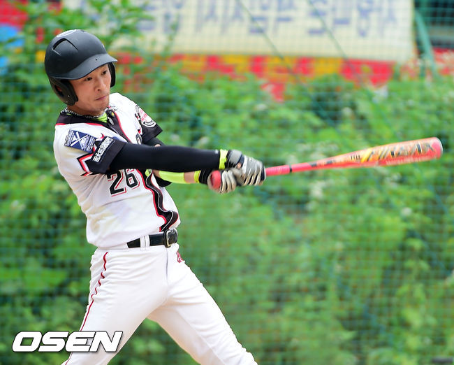 4회초 1사 주자 2,3루 서대전고 동문 야구단 문성록이 2타점 적시타를 날리고 있다.