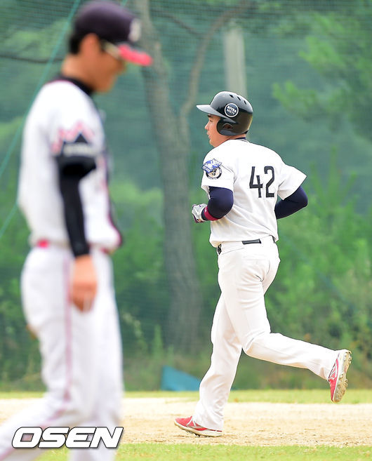 3회말 무사 주자 1루 샘 야구단 우병우가 좌중월 만루 홈런을 날린 후 그라운드를 돌고 있다.