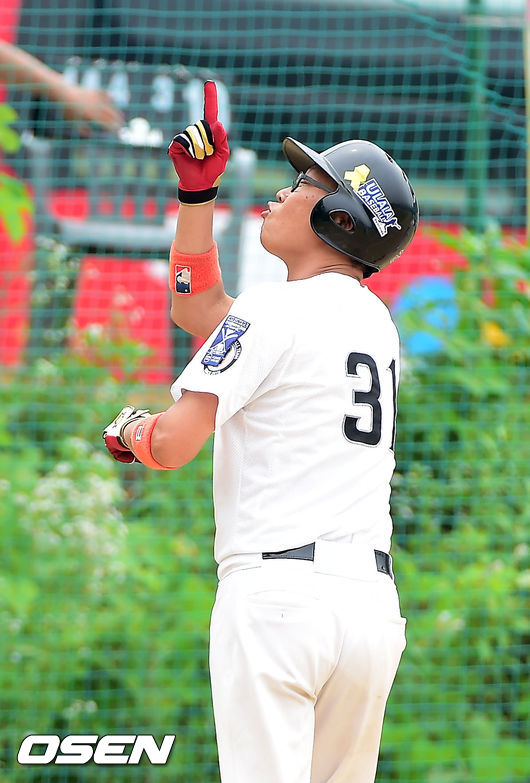 3회말 무사 샘 야구단 황석준이 솔로 홈런을 날린 후 세레모니를 하고 있다.