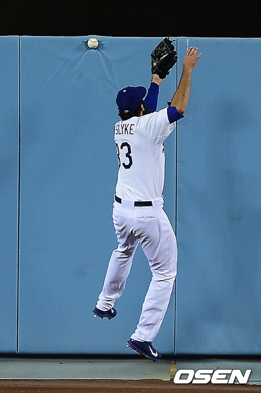 5회초 무사 1루 다저스 밴 슬라이크가 헤들리의 타구를 잡기위해 점프 캐치를 시도하고 있다.