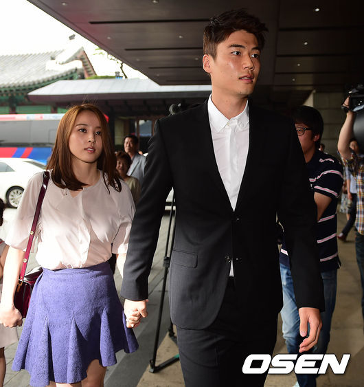 축구선수 기성용과 아내 한혜진이 12일 오전 서울 장충동 신라호텔에서 열리는 '블루드래곤' 이청용 결혼식에 참석하고 있다.