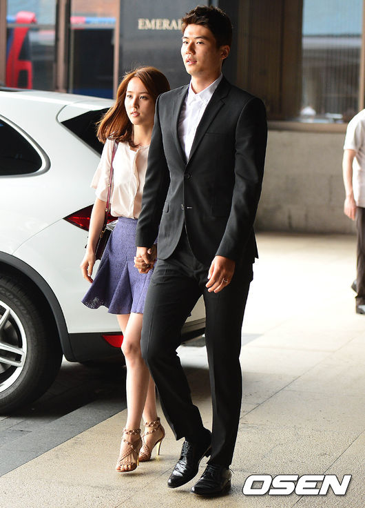 축구선수 기성용과 아내 한혜진이 12일 오전 서울 장충동 신라호텔에서 열리는 '블루드래곤' 이청용 결혼식에 참석하고 있다.