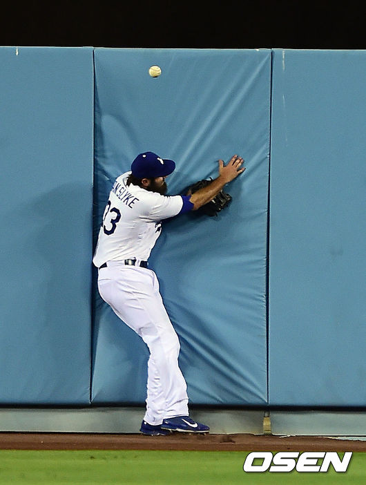 5회초 무사 1루 다저스 밴 슬라이크가 헤들리의 타구를 잡기위해 점프 캐치를 시도하고 있다.