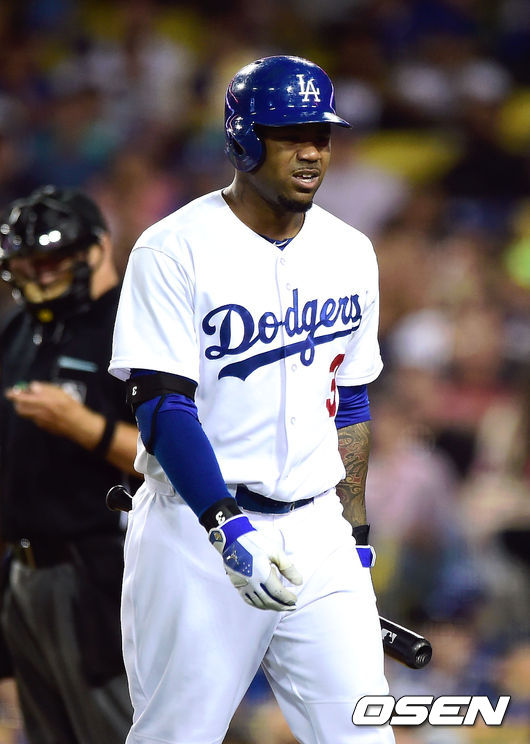 5회말 무사 다저스 크로포드가 대타로 나서 삼진을 당한 뒤 더그아웃으로 들어오고 있다.