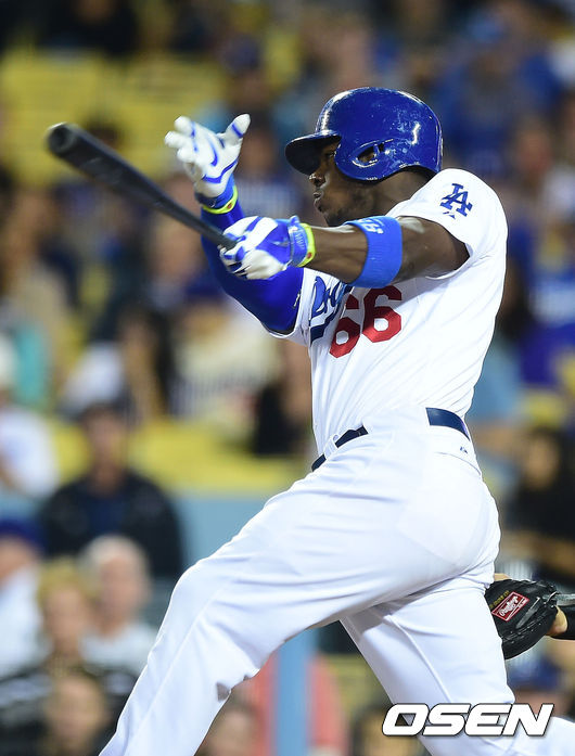 7회말 1사 1,3루 다저스 푸이그가 1타점 적시 2루타를 때리고 있다.