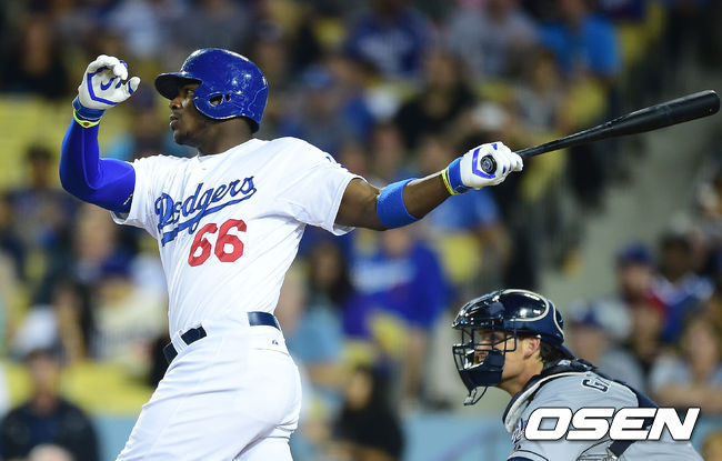 7회말 1사 1,3루 다저스 푸이그가 1타점 적시 2루타를 때리고 있다.