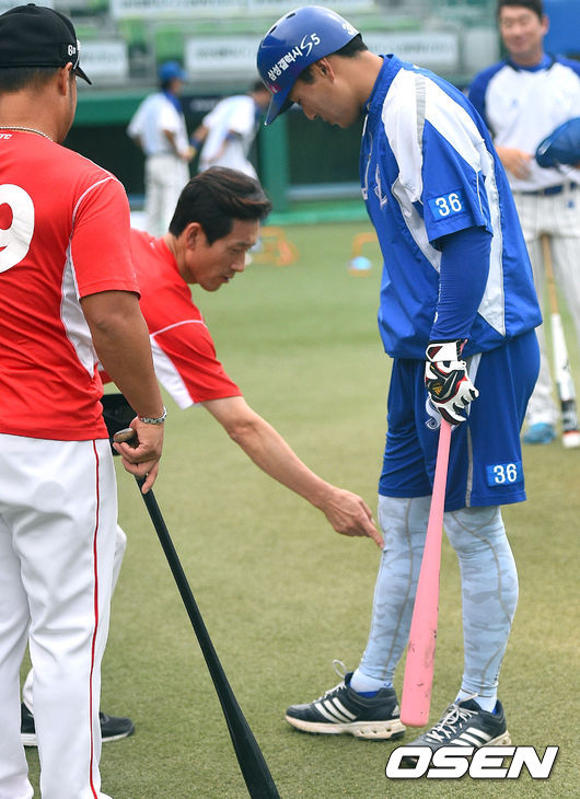 12일 오후 대구구장에서 열리는 2014 한국야쿠르트 세븐 프로야구 삼성 라이온스와 SK 와이번스의 경기전 삼성 이승엽이 SK 성준 코치와 이야기를 나누고 있다.