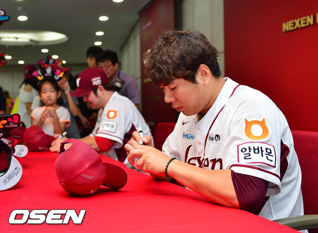 12일 오후 서울 목동야구장에서 열린 '2014 한국야쿠르트 세븐 프로야구' 넥센 히어로즈와 NC 다이노스의 경기, 경기에 앞서 열린 박병호와 강정호의 팬 사인회에서 강정호와 박병호가 팬에게 사인을 해 주고 있다.