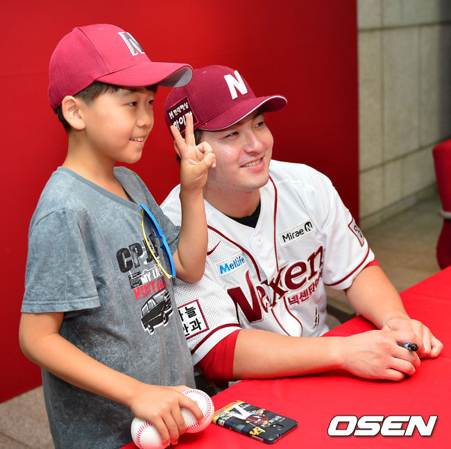 12일 오후 서울 목동야구장에서 열린 '2014 한국야쿠르트 세븐 프로야구' 넥센 히어로즈와 NC 다이노스의 경기, 경기에 앞서 열린 박병호와 강정호의 팬 사인회에서 와 박병호가 아이 팬에게 사인을 해준 후 기념 촬영을 해주고 있다.