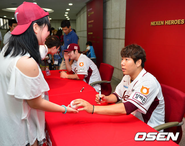 12일 오후 서울 목동야구장에서 열린 '2014 한국야쿠르트 세븐 프로야구' 넥센 히어로즈와 NC 다이노스의 경기, 경기에 앞서 열린 박병호와 강정호의 팬 사인회에서 강정호와 박병호가 팬에게 사인을 해 주고 있다.
