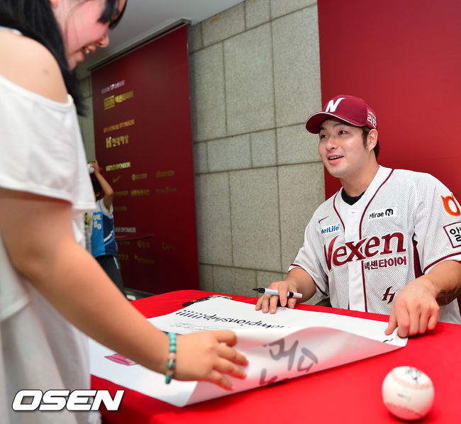 12일 오후 서울 목동야구장에서 열린 '2014 한국야쿠르트 세븐 프로야구' 넥센 히어로즈와 NC 다이노스의 경기, 경기에 앞서 열린 박병호와 강정호의 팬 사인회에서 박병호가 한 팬에게 사인을 해 주고 있다.