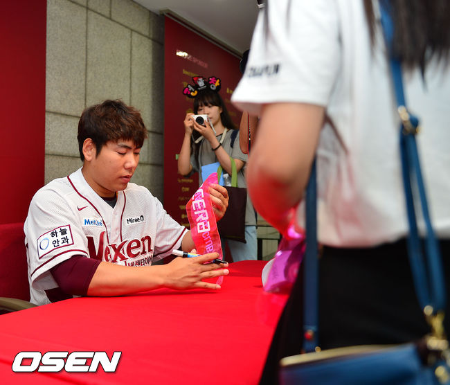 12일 오후 서울 목동야구장에서 열린 '2014 한국야쿠르트 세븐 프로야구' 넥센 히어로즈와 NC 다이노스의 경기, 경기에 앞서 열린 박병호와 강정호의 팬 사인회에서 강정호가 여성팬에게 사인을 해 주고 있다.