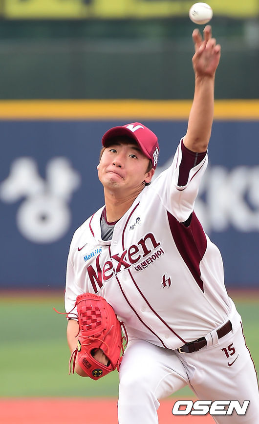 12일 오후 서울 목동야구장에서 열린 '2014 한국야쿠르트 세븐 프로야구' 넥센 히어로즈와 NC 다이노스의 경기, 넥센 선발 오재영이 힘차게 공을 뿌리고 있다.