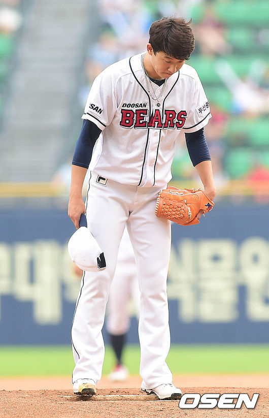 두산 선발 오현택이 투구에 앞서 모자를 벗어 인사하고 있다.