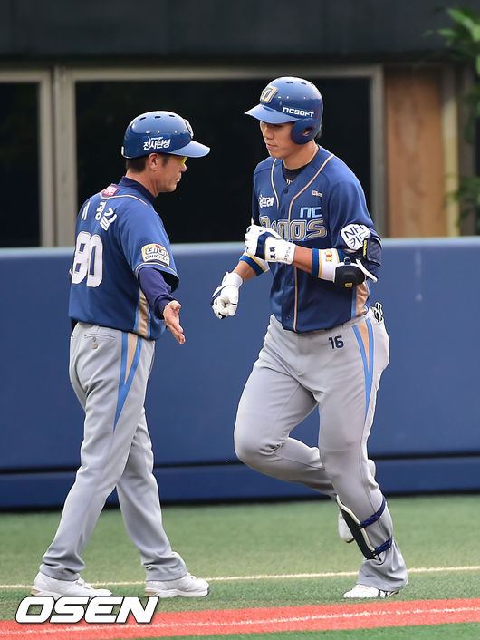 12일 오후 서울 목동야구장에서 열린 '2014 한국야쿠르트 세븐 프로야구' 넥센 히어로즈와 NC 다이노스의 경기, 2회초 2사 주자 없는 상황에서 NC 모창민이 우월 선취 솔로 홈런을 날린 후 3루에서 이광길 코치와 하이파이브를 하고 있다.