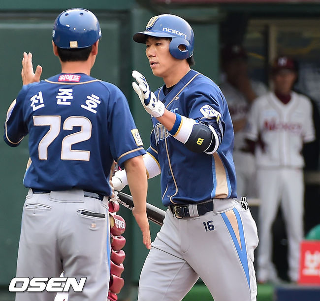 12일 오후 서울 목동야구장에서 열린 '2014 한국야쿠르트 세븐 프로야구' 넥센 히어로즈와 NC 다이노스의 경기, 2회초 2사 주자 없는 상황에서 NC 모창민이 우월 선취 솔로 홈런을 날린 후 홈에서 전준호 코치와 하이파이브를 하고 있다.