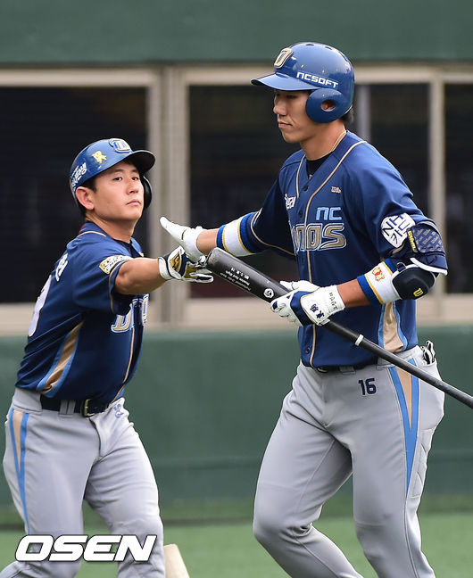12일 오후 서울 목동야구장에서 열린 '2014 한국야쿠르트 세븐 프로야구' 넥센 히어로즈와 NC 다이노스의 경기, 2회초 2사 주자 없는 상황에서 NC 모창민이 우월 선취 솔로 홈런을 날린 후 홈에서 손시헌과 하이파이브를 하고 있다.