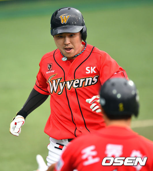 12일 오후 대구구장에서 열린 2014 한국야쿠르트 세븐 프로야구 삼성 라이온스와 SK 와이번스의 경기, 2회초 2사 1루 SK 나주환이 2점 홈런을 날리고 동료들의 축하를받고 있다.