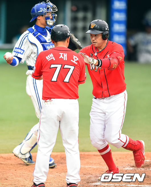 12일 오후 대구구장에서 열린 2014 한국야쿠르트 세븐 프로야구 삼성 라이온스와 SK 와이번스의 경기, 2회초 2사 1루 SK 나주환이 2점 홈런을 날리고 동료들의 축하를받고 있다.