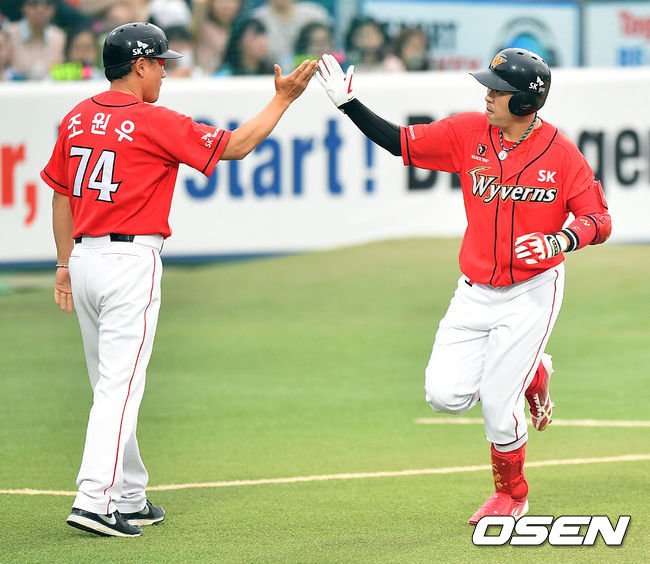 12일 오후 대구구장에서 열린 2014 한국야쿠르트 세븐 프로야구 삼성 라이온스와 SK 와이번스의 경기, 2회초 2사 1루 SK 나주환이 2점 홈런을 날리고 조원우 코치의 축하를받고 있다.