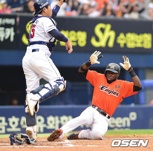 2회초 한화 공격 2사 1, 3루 상황 조정원 타석 때 3루 주자 피에가 더블스틸로 홈까지 파고들어 세이프되고 있다.