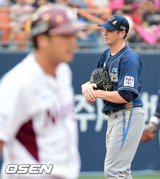 12일 오후 서울 목동야구장에서 열린 '2014 한국야쿠르트 세븐 프로야구' 넥센 히어로즈와 NC 다이노스의 경기, 3회말 2사 주자 3루 넥센 이택근에게 볼넷을 내준 NC 선발 찰리가 아쉬운 표정을 짓고 있다.