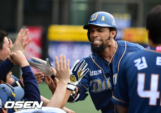 12일 오후 서울 목동야구장에서 열린 '2014 한국야쿠르트 세븐 프로야구' 넥센 히어로즈와 NC 다이노스의 경기, 4회초 NC 선두타자 테임즈가 우월 솔로 홈런을 날린 후 덕아웃에서 기뻐하고 있다.