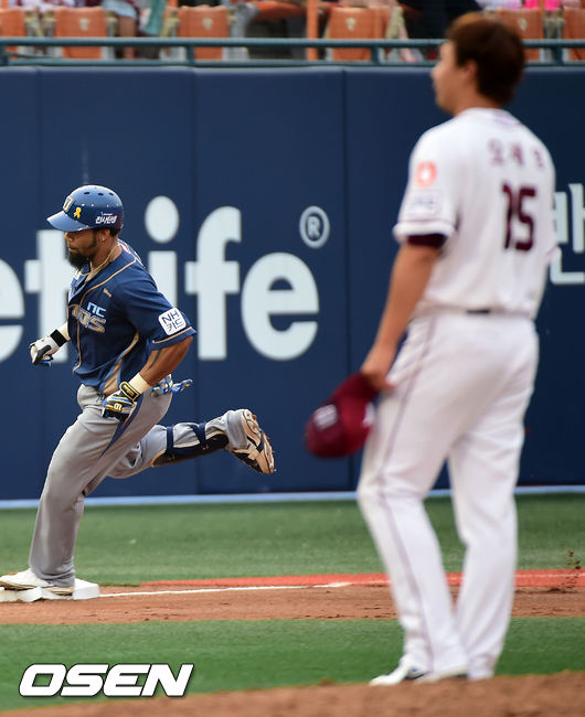 12일 오후 서울 목동야구장에서 열린 '2014 한국야쿠르트 세븐 프로야구' 넥센 히어로즈와 NC 다이노스의 경기, 4회초 NC 선두타자 테임즈가 우월 솔로 홈런을 날린 후 그라운드를 돌고 있다.