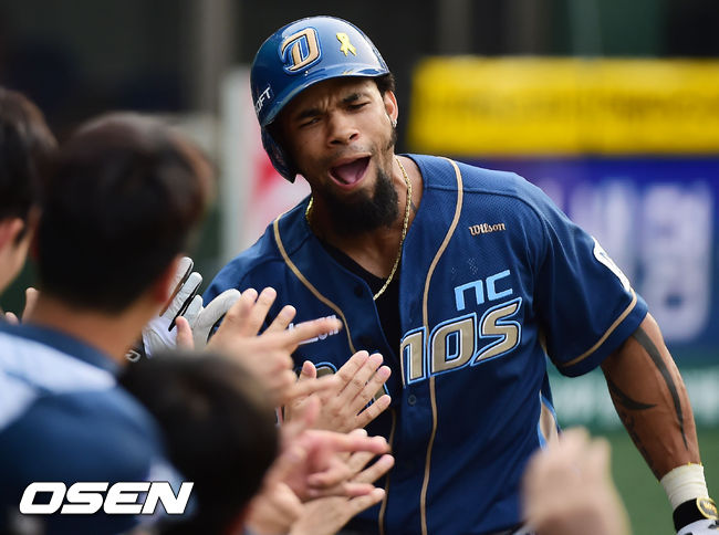 12일 오후 서울 목동야구장에서 열린 '2014 한국야쿠르트 세븐 프로야구' 넥센 히어로즈와 NC 다이노스의 경기, 4회초 NC 선두타자 테임즈가 우월 솔로 홈런을 날린 후 덕아웃에서 동료들과 하이파이브를 하고 있다.