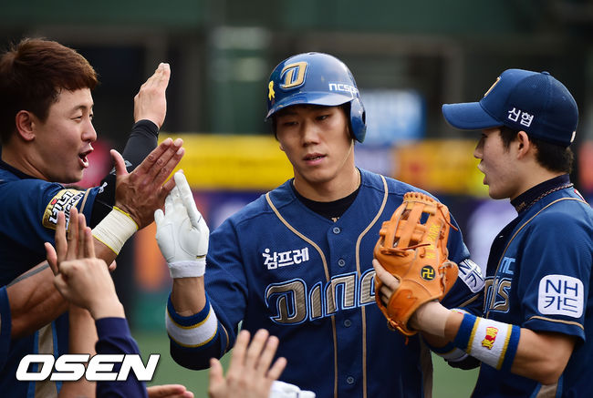 12일 오후 서울 목동야구장에서 열린 '2014 한국야쿠르트 세븐 프로야구' 넥센 히어로즈와 NC 다이노스의 경기, 4회초 1사 주자 없는 상황에서 NC 모창민이 연타석 솔로 홈런을 날린 후 덕아웃에서 동료들과 하이파이브를 하고 있다.
