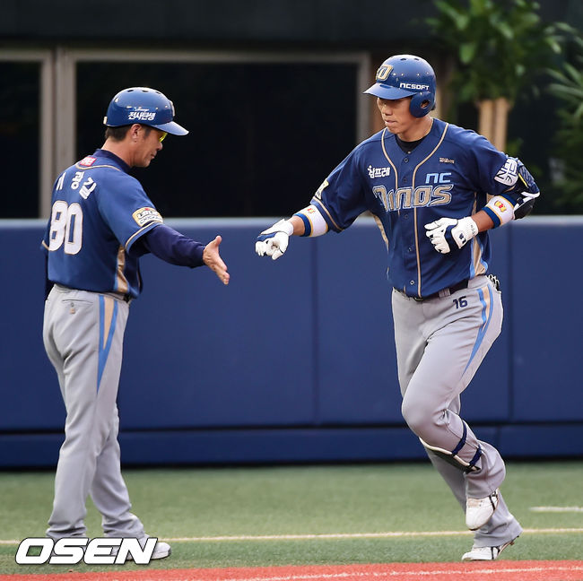 12일 오후 서울 목동야구장에서 열린 '2014 한국야쿠르트 세븐 프로야구' 넥센 히어로즈와 NC 다이노스의 경기, 4회초 1사 주자 없는 상황에서 NC 모창민이 연타석 솔로 홈런을 날린 후 3루에서 이광길 코치와 하이파이브를 하고 있다.