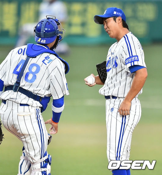 12일 오후 대구구장에서 열린 2014 한국야쿠르트 세븐 프로야구 삼성 라이온스와 SK 와이번스의 경기, 3회초 2실점 허용한 삼성 배영수 선발투수가 이흥련 포수와 이야기를 나누고 있다.