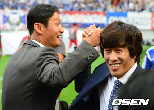 12일 오후 서울월드컵경기장에서 '현대오일뱅크 K리그 클래식 2014' 15라운드 FC 서울과 수원 삼성의 경기, 서울 최용수 감독과 수원 서정원 감독이 반갑게 인사를 나누고 있다.